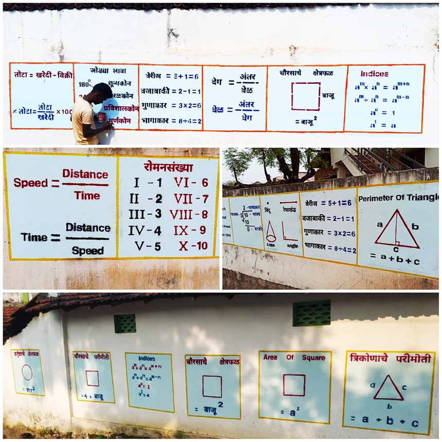 Sri Akshay Wakudkar from Nandgaon Ghosari Village in Pombhurna tahasil of Chandrapur district came to Nagpur to pursue Engineering study in 2012. He took the admission for Bachelor of Engineering (Electronics) in Yashwantrao Chavan College of Engineering Nagpur. While studying he created the charts of Mathematical formulas and displayed them on the walls of his room. It was an easy way to memorise them. So Akshay took this method of fast memorising formulas from his room to village walls. While painting the walls of village, the team interacts with the teachers and students of village schools and inspire them for the study of Mathematics. Not only school boys but the students preparing for competitive examinations are also benefited by this project. Subsequently his younger brother Omkar Wakudkar also joined in and accelerated the pace of the project. Prof Satre of Navegaon, Ganesh Arekar and Pravin Lole helped Akshay in his work. One by one people joined this project which culminate into a team.